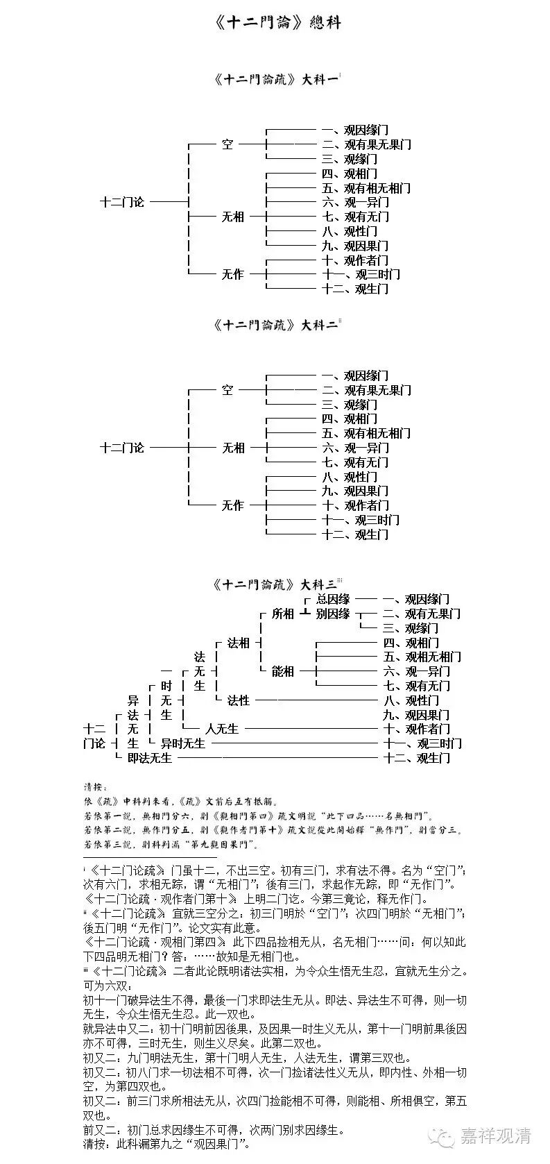 2、 《 十二门论疏》 : 宜就三空分之 : 初三门明於“空门” ; 次四门明於“无相门”;後五门明“无作门”。论文实有此意。