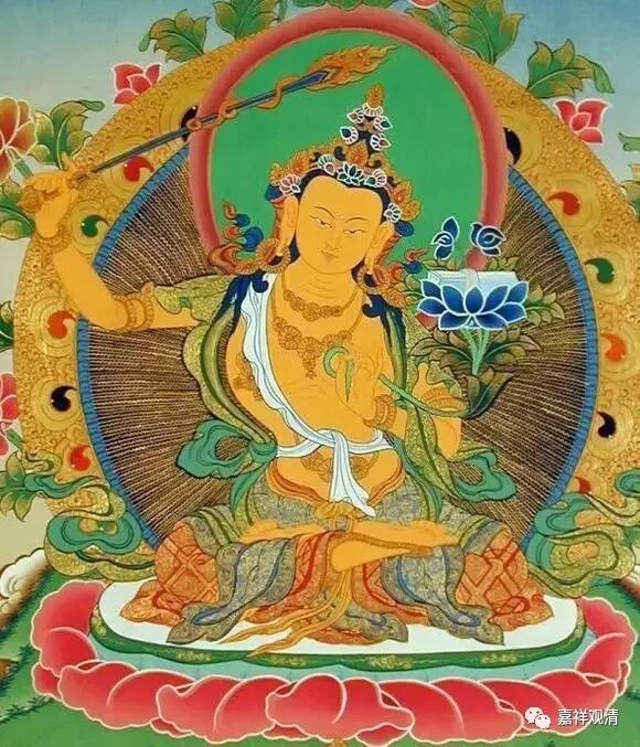 观想:从空性状态中,刹那间榜字转成莲花、阿字转成月垫,其上自心转成红黄色“滴”字,自身至尊文殊阿日 阿 巴杂那,身色红黄,一面二臂。右手将火焰炽燃之智慧剑举在空中,左手以拇指、食指当胸持乌巴拉花茎,花瓣在耳畔盛开,上有智慧经函。足金刚跏趺坐。具十六岁童子相,发具五髻,相好庄严,宝饰天衣,额间标以嗡字、喉间标以阿字、心间标以吽字。自舌转成双刃剑,尖端锋利,向上竖立,具光之自性,(舌)根部标以滴字,周围“嗡阿日 阿 巴杂那”咒轮围绕。