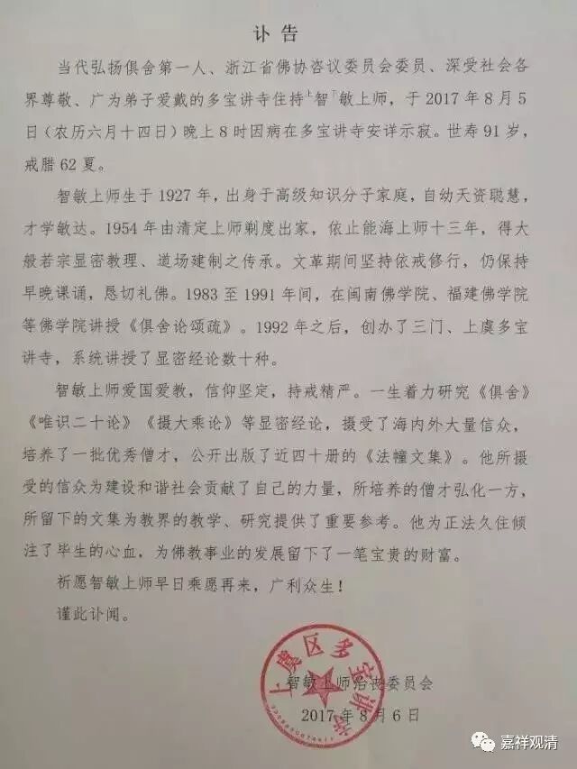 当代弘扬俱舍第一人、浙江省佛协咨议委员会委员、深受社会各界尊敬、广为弟子爱戴的多宝讲寺住持上智下敏上师,于2017年8月5日(农历六月十四日)晚上8时因病在多宝讲寺安详示寂。世寿91岁,戒腊62夏。