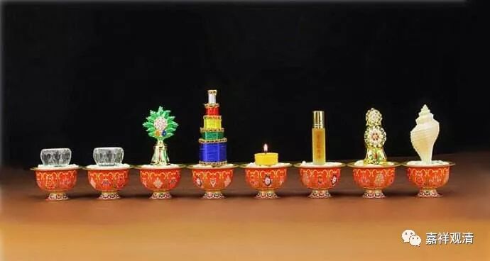 印度人平时是赤脚的嘛,所以当你请印度人过来家里的时候,都要给客人洗个脚,或者意思一下象征性地也要放上一盆水。所以这个 “洗足水”的意思就是请佛菩萨来的时候,请他们洗脚。其实我们也没有真的将涂香涂在佛的身上嘛,但意思是说,这个就是“涂香水”,而那个是请佛菩萨喝的水 ,然后这是吃的,那是喝的 …… 就是这样。