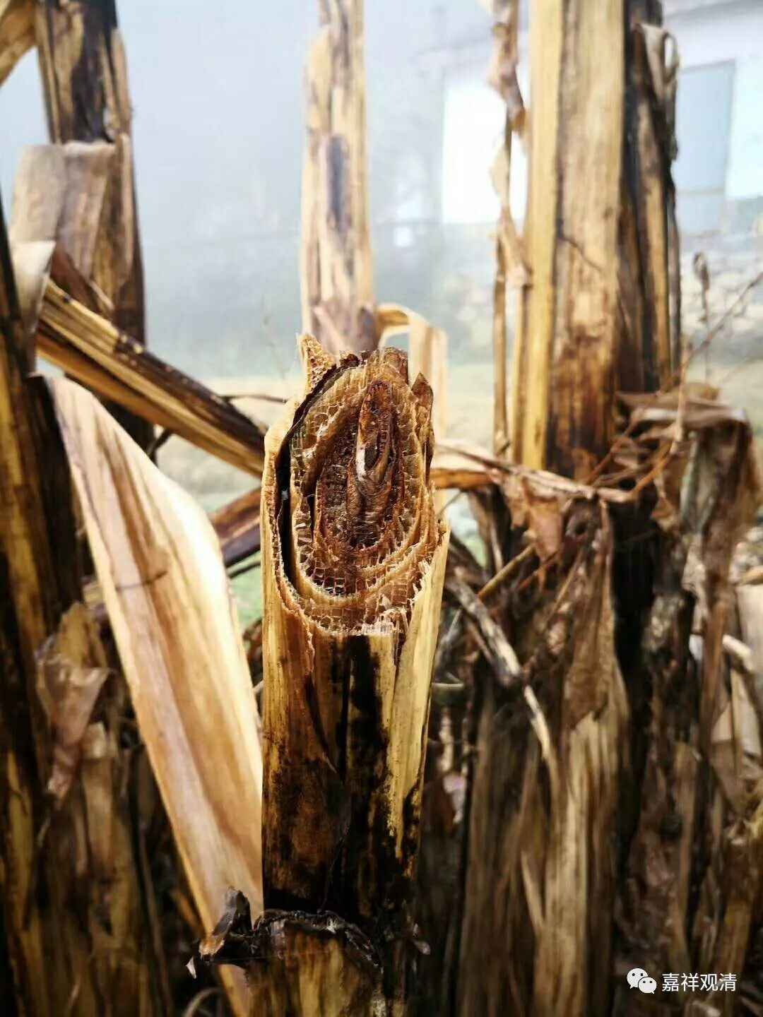 上图就是芭蕉树,常见,下图是它被劈开的样子。层层剥开,无有中实。所以佛经常用芭蕉树来打比方,比喻无有实体。