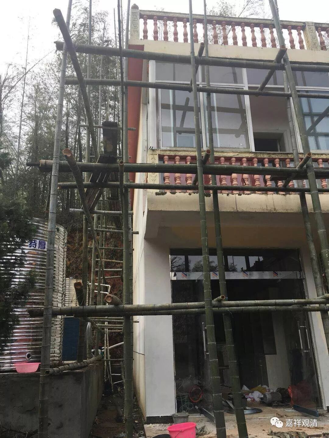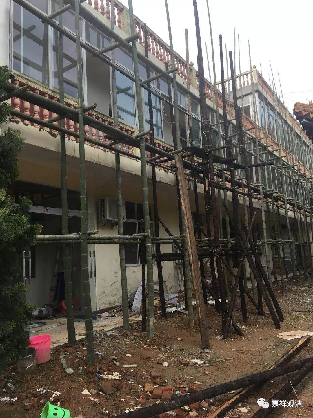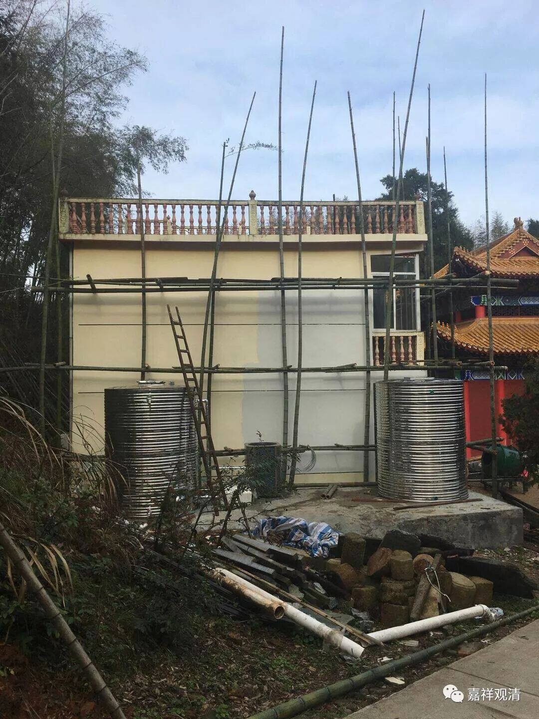 莲花山白云寺现正改建原僧寮,古建之乡大冶来的古建工程队也已经到位,现已搭完脚手架,将对僧寮进行加层和内外防水、内外装修部分,木匠也在打制衣橱、书橱等学僧家具。
