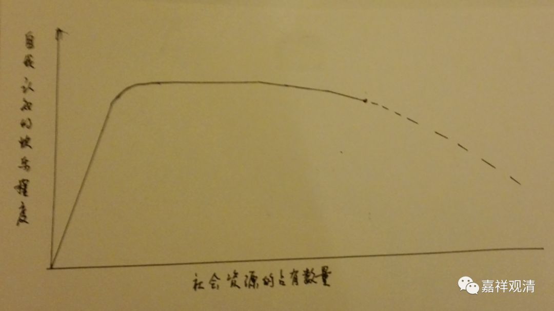 你 把再多 的东西给他,他还是贪心很重 —— 大部分人都是这样哦 。 这背后有其心理原因 ——世间人的快乐,人们对快乐的自我感知度,和占有资源的数量积累,是线性分布的吗?我觉得假如做一个统计的话,最初会是一个快速上升曲线,以后是有一段略微平缓的曲线。大概在一个极端之后 还会下降如下图,因为当物质占有到一定程度,没有其他人可以做对比,那种因对比而来的幸福感绝对会降低。不是有一句话吗 ——幸福感来源于对比。(有机会的话我们可以编一个心理测验。)