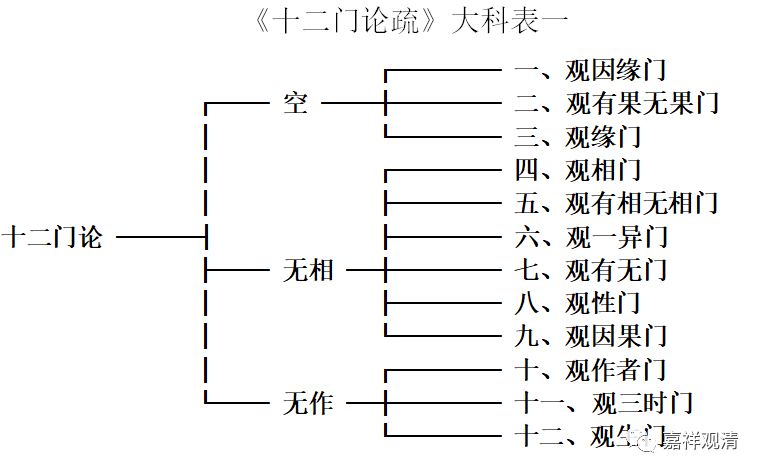 从《十二门论》本身的结构来说,吉藏在《十二门论疏》正文当中的主张比较合理,即: “空门”有三:观因缘门、观有果无果门、观缘门;“无相门”有四:观相门、观有相无相门、观一异门、观有无门;“无作门”有三:观作者门、观三时门、观生门。