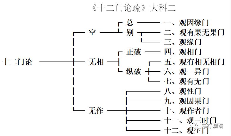 摄山诸师对《十二门论》元是不分科的,即,仅就 “十二门”来解释而不作总的科摄。《十二门论疏》卷一: