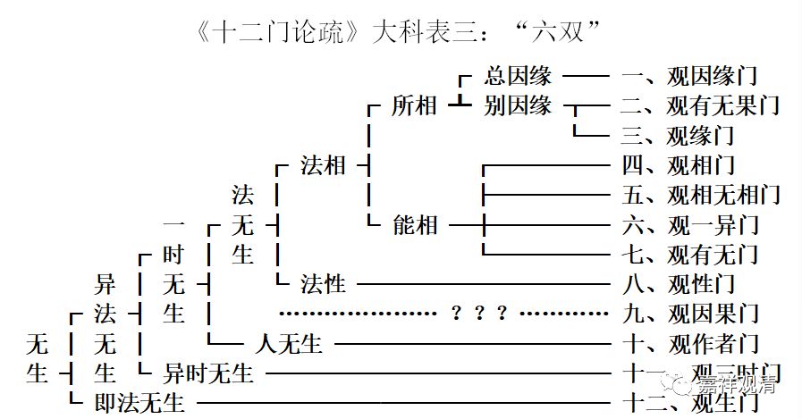 以此看来,吉藏《十二门论疏》的第三中科判恰是摄山师承不分科版本的加工版 ——“就无生分之”就是摄山师承的“法无不穷,一切法空”;“可为六(七)双”就是摄山师承的“因备婉转,始终相成”。这种依师说而改定版和他依摄山师承改定《中观论》科判的的做法是一脉相承的。