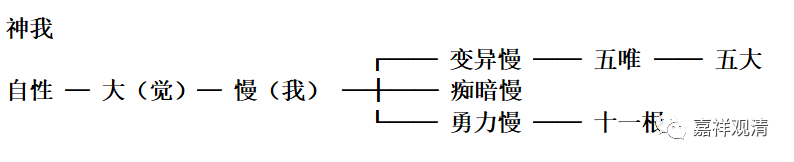 …… 从 “ 主 ” 产生 “ 大 ”…… 从 “ 大 ” 生 “ 我慢 ” ,而 “ 我慢 ” 分为 : 具变易的我慢、具精力的我慢和具昏暗的我慢。从前者生 “ 五唯 ” ,再从 “ 五唯 ” 生出 “ 五大种 ” 。从第二者生出 “ 十一根 ” 。第三者能影响 ( 制约 ) 其余二种我慢。