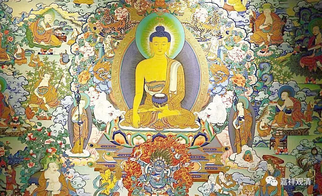“也可观想顶上上师天,犹如灯光一分为二般,分出第二尊上师天身融入自身,在八大狮子擎举的高广宝座上,杂色莲花日月轮为垫,自成本师释迦牟尼佛,身紫磨金色,乃至金刚跏趺而坐,朗然如空中彩虹,了无自性,一心缘此而修习。”