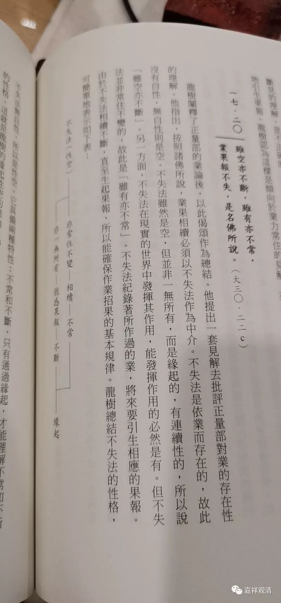 “显然龙树在这一总结的偈颂中,重在不失法的空的性格上。 即是说,不失法可保证业果联系的关系,但它不是具有自性的常住不变的东西。”