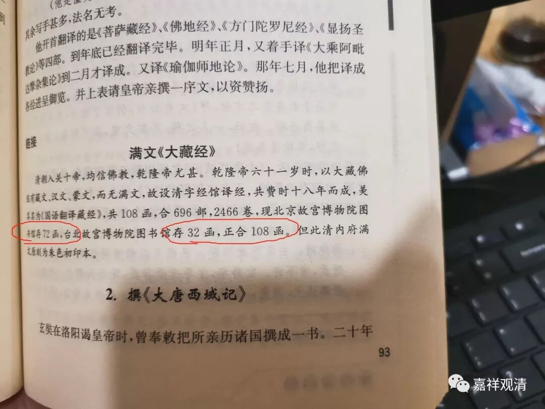 这段“满文大藏经”被塞在这里,完全不知道是出于什么“思路”。而且,这里有谁数学不好吗?我都看傻了,“北京故宫博物院图书馆存 72 函,台北故宫博物院图书馆存 32 函,正合 108 函”—— 72+32=108 ?