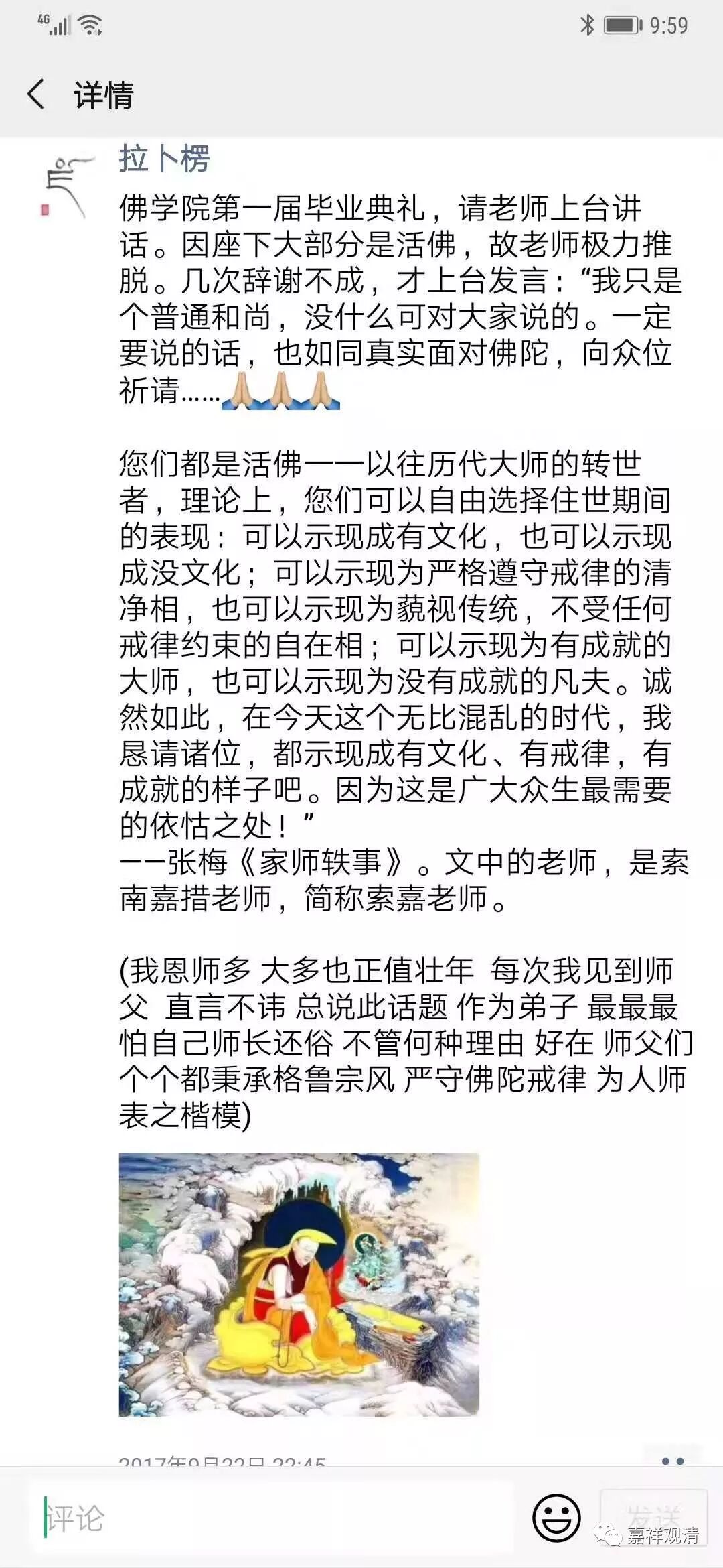 我好像发过两次了,这是一个真实的事情 (见张梅《家师轶事》) ,是发生在中国佛学院的故事。现在的中国佛学院专门有一个藏传佛教的班,学院里有一位老师是噶举派的,他的水平很好,但为人很低调,他本身不是活佛。有一届毕业的时候,就请这位老师来说两句,一开始他还不肯说,后来非要让他说,他就答应了。我听了他说的,非常感动,而且有点觉得自己心里也是这样想的,但他比我们说的好多了。