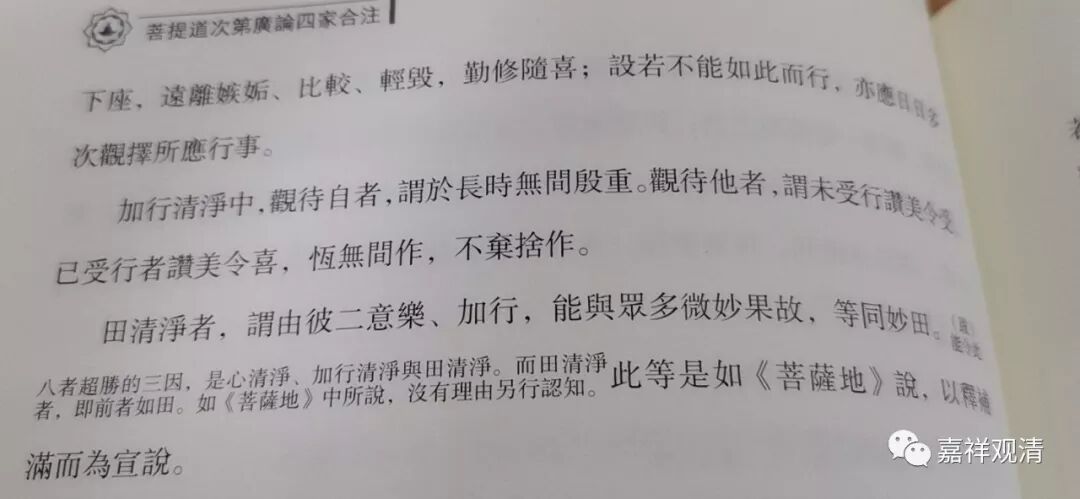 前面说具备 “三缘”能生“妙异熟”,三缘就是1、心清净;2、加行清净;3、田清净。这里说到“田清净”时,其内容就是前二者——“心清净”和“加行清净”,因为他们能“予众果故”,“等”同于能生妙果的殊胜“妙田”,所以叫“田清净”。