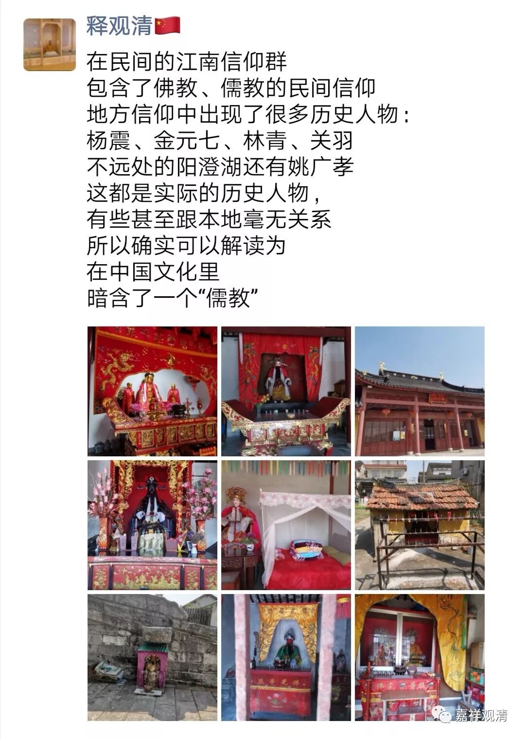 乡绅系统带领大家拜的不是“鬼”而是“神”,这是“儒教”的“天道”之一部分。若拿来和道教做对比,在道教系统里就是鬼、仙了。道教的仙(五种:鬼仙、人仙、地仙、天仙、大罗金仙,乃至给罗汉流了“大罗金仙”的位置)是要借“修真”得来的,而“儒教”的“修身”,是“为国为民”,生而正直,死后,或由朝廷(如各地的“张巡庙”、“关公庙”)、或由士绅公推(如金泽的杨震庙、林青庙、金元七总管庙、浦东的欧阳修庙)而封神。可见,道教和佛教以外,中国的传统当中“儒教”实际一直是一条暗含着的“教”(虽然他的教、道、果非常模糊,可是,“中国人”的“中国佛教”不也一样的模糊混乱吗?),而且他也自觉地当作“教化”、“教育”在用——比如常说“神道设教”,从这个角度来说,“儒教”的“教”和佛教的“教”字的含义相通着。