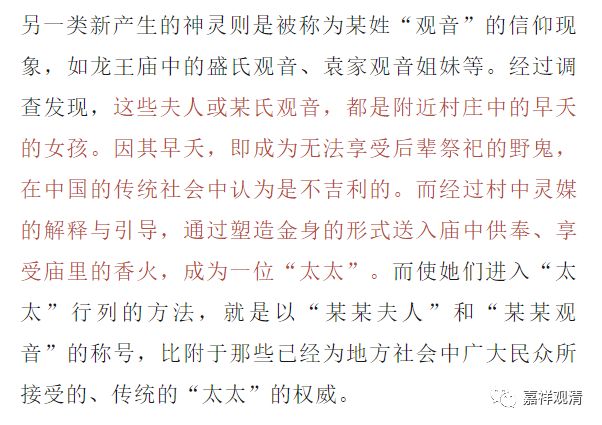 另一类新产生的神灵则是被称为某姓 “观音”的信仰现象,如龙王庙中的盛氏观音、袁家观音姐妹等。经过调查发现,这些夫人或某氏观音,都是附近村庄中的早夭的女孩。因其早夭,即成为无法享受后辈祭祀的野鬼,在中国的传统社会中认为是不吉利的。而经过村中灵媒的解释与引导,通过塑造金身的形式送入庙中供奉、享受庙里的香火,成为一位 “太太”。而使她们进入 “太太”行列的方法,就是以“某某夫人”和“某某观音”的称号,比附于那些已经为地方社会中广大民众所接受的、传统的“太太”的权威。