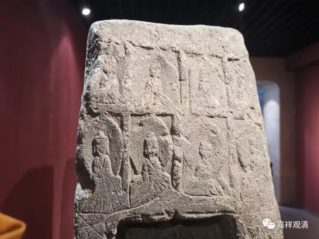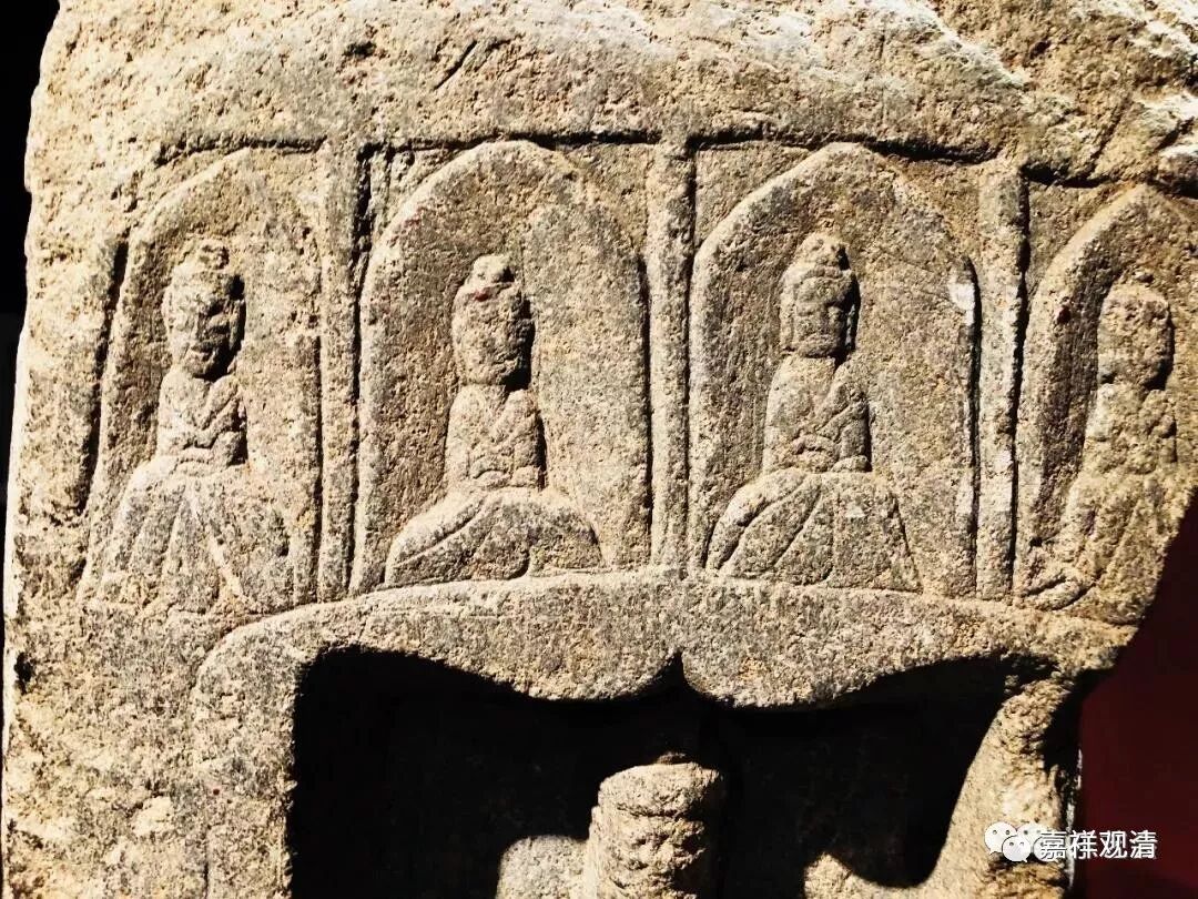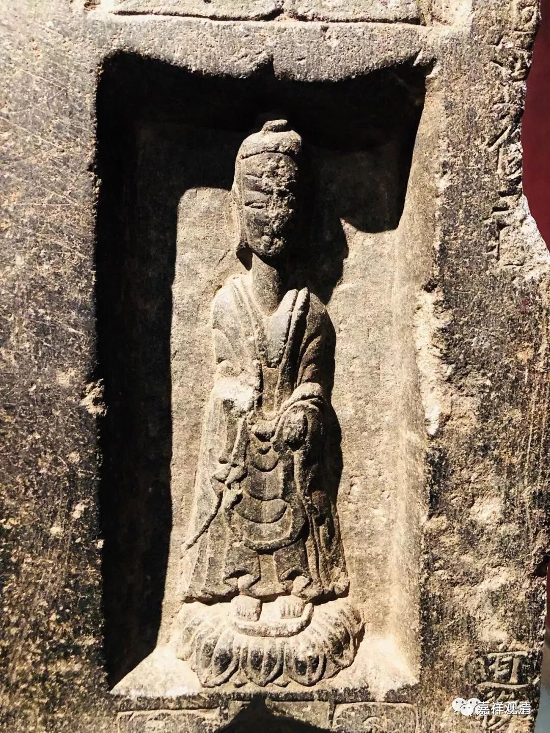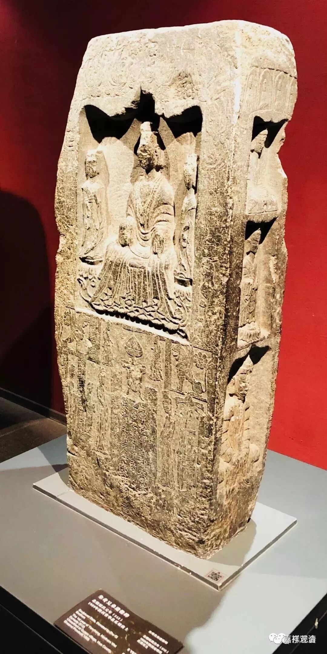 就是这块碑。这块碑四面都有造像,但是看现在右手的这一个侧面,这是一个三层的“石窟”。