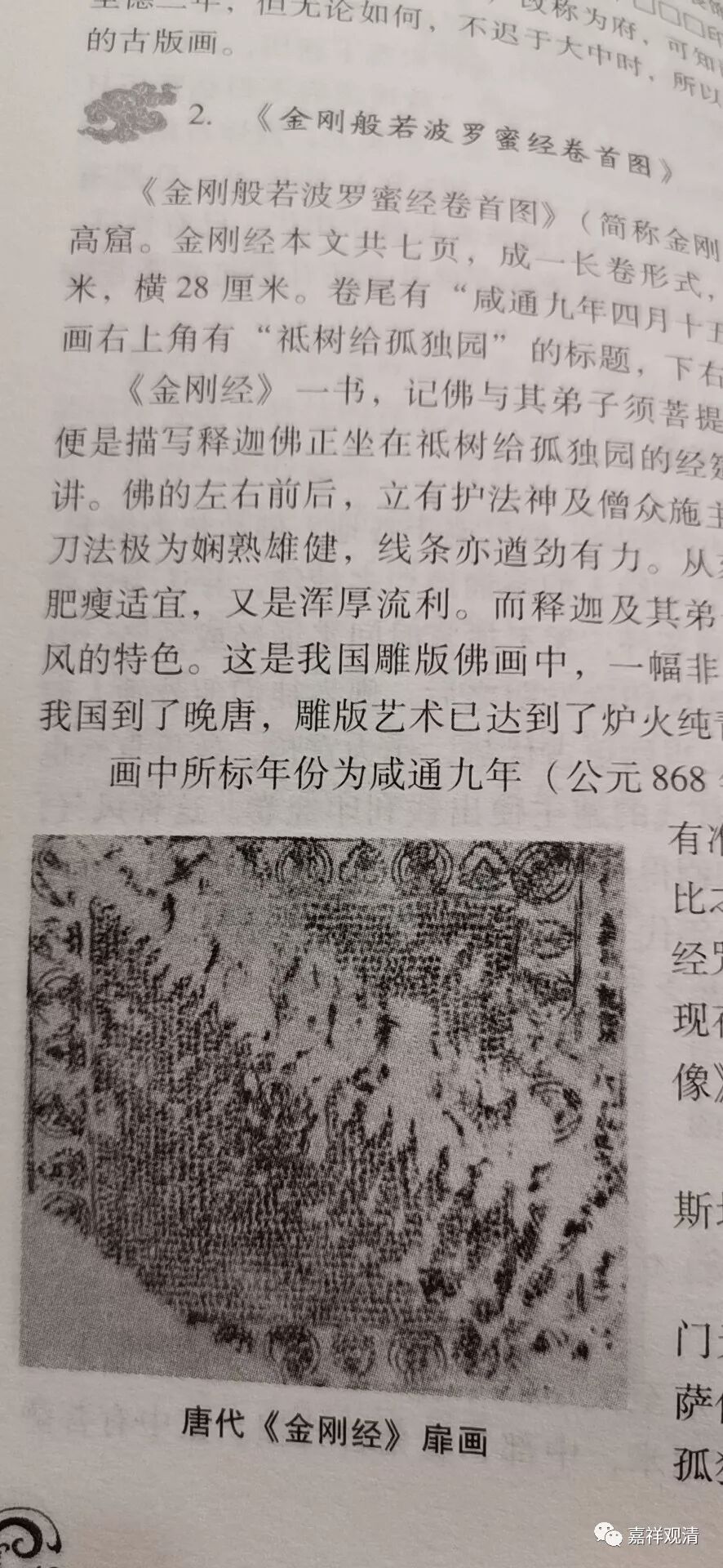 1900年发现与甘肃敦煌藏经洞的一幅《金刚经》卷首的版画,最初被认为是现存世界最早的版画,此件上有款“咸通九年四月十五日为二亲敬造普施……”,明确纪年为咸通九年,即公元 868 年,这比欧洲最早的木版画《圣克里斯道夫像》要早 600 多年。但成都《梵文陀罗尼经咒图》的出土,推高了最早版画的年代,此《金刚经说法图》的“最早”前面不得不加几个字——“现存世界最早有明确纪年的版画 ”。(但很多书还没改过来这个“最早”,源于不知稍后发现的成都出土的《梵文陀罗尼经咒图》。我记得我们大学文献教材里就还在谈“敦煌本《金刚经》最早”,我向老师表示反对,反对无效一刚……)