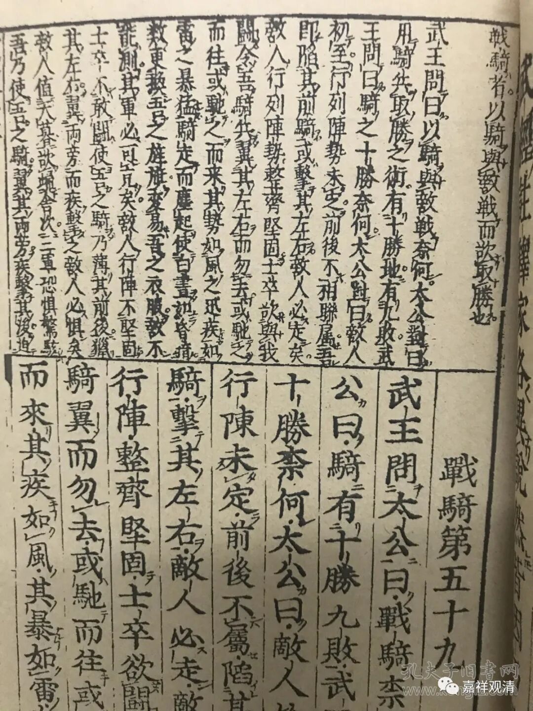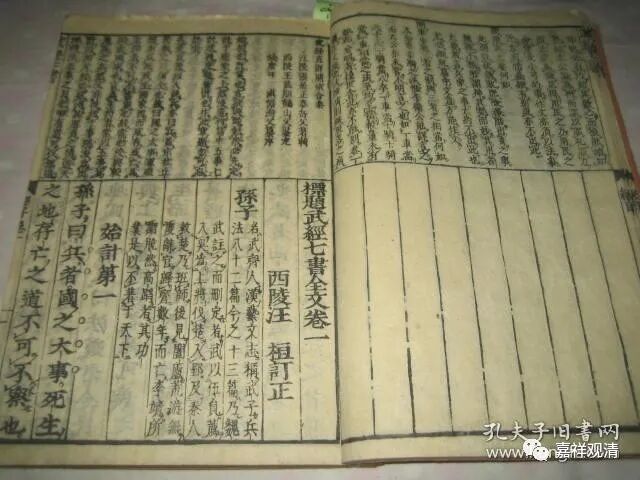 《武经七书》是中国古代著名的兵书集成。这本和刻本的《鳌头(武经)七书》,是复刻清顺治年间的清刻本。版子里看得出来,清刻本的书名原来叫《标题<武经七书>全文》。这个“标题”的版式,和刻本就叫“鳌头”。
