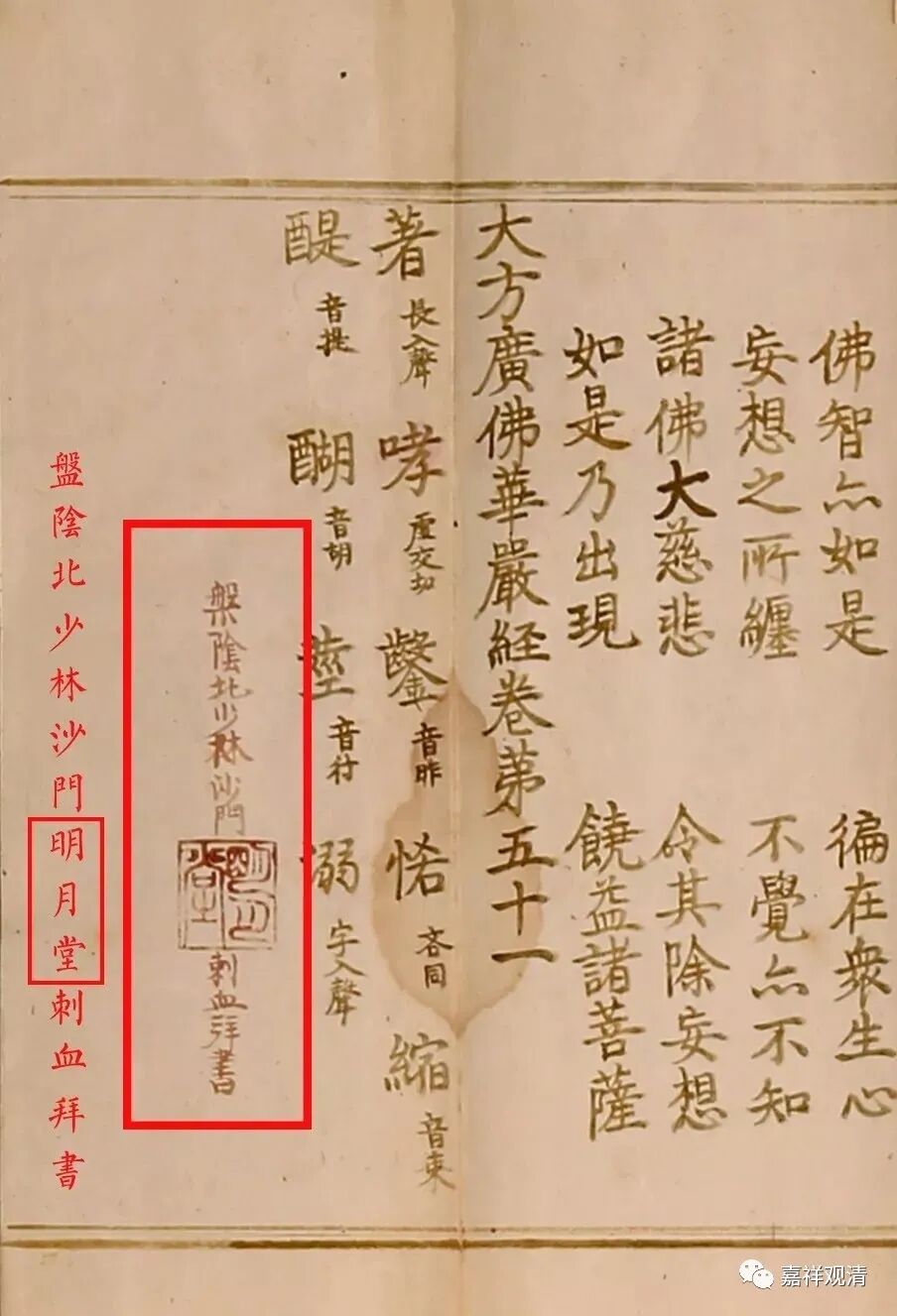 此件为盘阴北少林沙门刺血写经,末尾有“盘阴北少林沙门明月堂刺血拜书”题识。