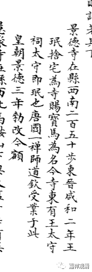 “景德寺,在县西南二百五十步。东晋咸和二年,王珉舍宅为寺,赐宝马为名。今寺东有王太守祠,太守即珉也。唐国一禅师道钦受业于此。皇朝景德三年敕改今额。 ”