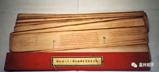 梵夹装,又叫梵箧装,就是售书兄弟说的 “梵伽装”,其实是印度经典的装帧方式,今天南传的贝叶经系统也还有在用的。书写在截成长条的贝叶纸上,中间有两个洞可以把书页穿起来以防止散乱。