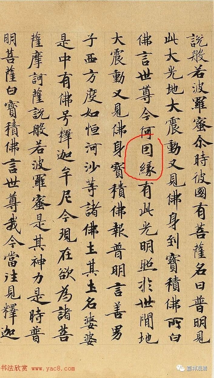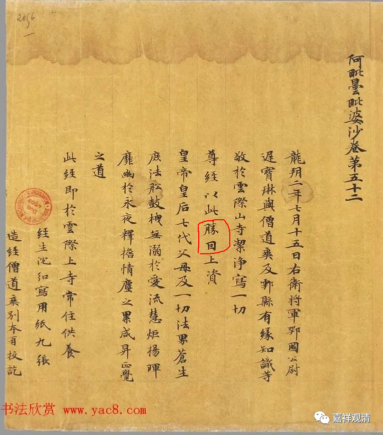 这是一件16年嘉德拍卖的《唐贤写经遗墨并近代诸家诗画》中的一页(成交价5750万元!!!)。这一页是《摩诃般若波罗密经》里面的一段。此处也有和《阿毗昙毗婆沙》题记里同样的字样,也读作“因”。