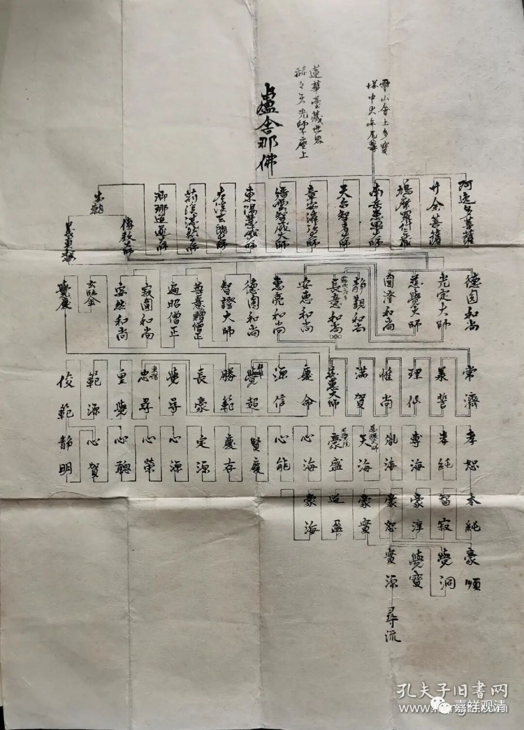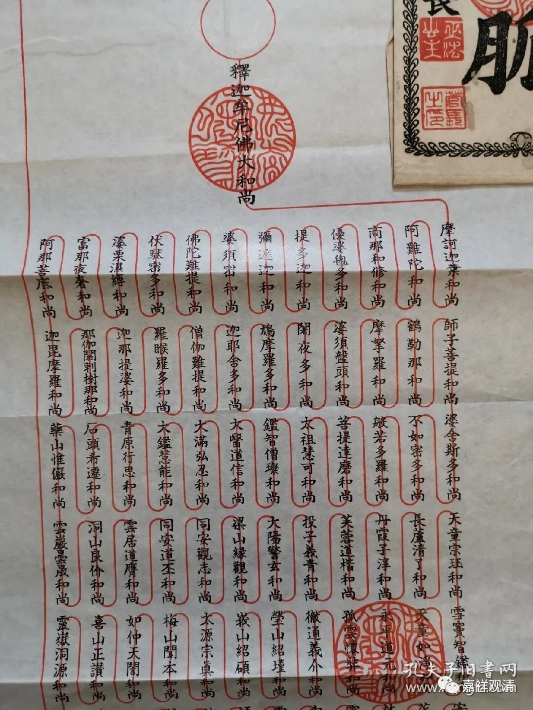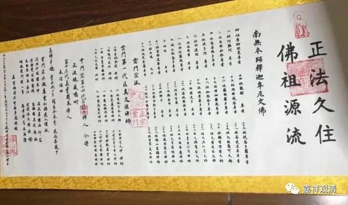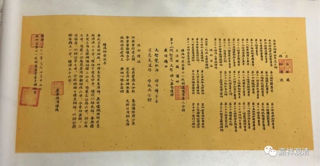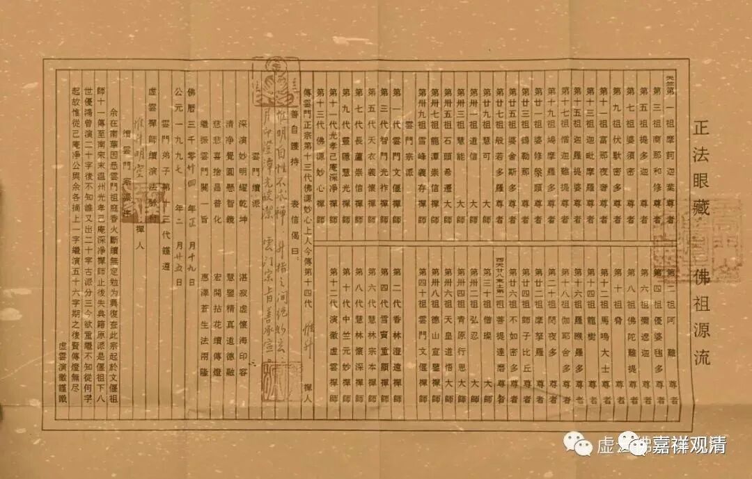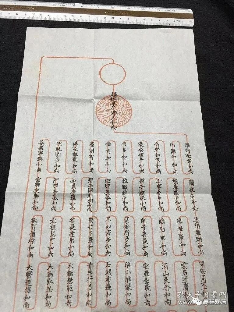 上面这段,看起来,像是禅宗的血脉图(传承祖师图)。这件“归依戒牒”是曹洞宗的。血脉传承祖师里有洞山良价禅师。