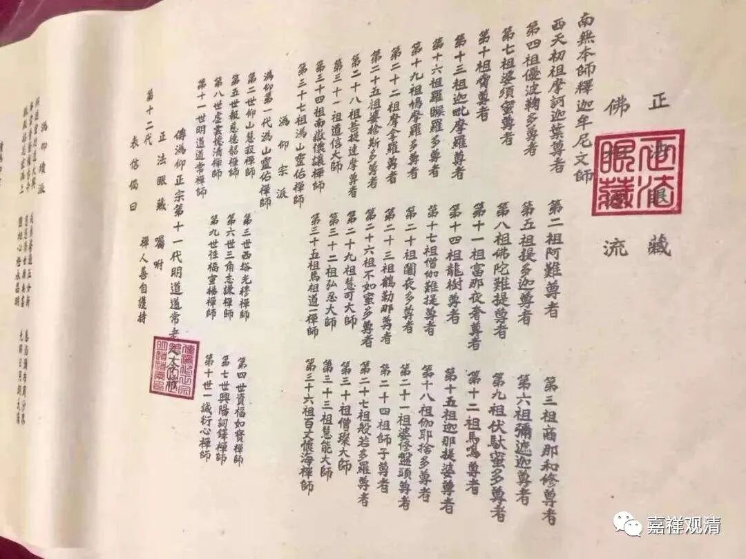 今天的禅宗里面有代表传承的法卷,这是什么呢?就是师父给你传法以后(也可以说同时),要给你一个证明,在师父给你的这个法卷上,最早可以从前面七个佛开始写,比如说前面庄严劫的第一个佛、第二个佛开始,到释迦牟尼佛,然后再一路写下来,最后写到你师父本人再传给你,谁谁谁受法于谁谁谁,再给你起个名字。比如说妙禅……哈哈,我自己的名字都忘了,不好意思哈。师父写一个法卷,再给你起一个这个法派的名字,就写下来,我手里也有一张。这个就是法卷传承。