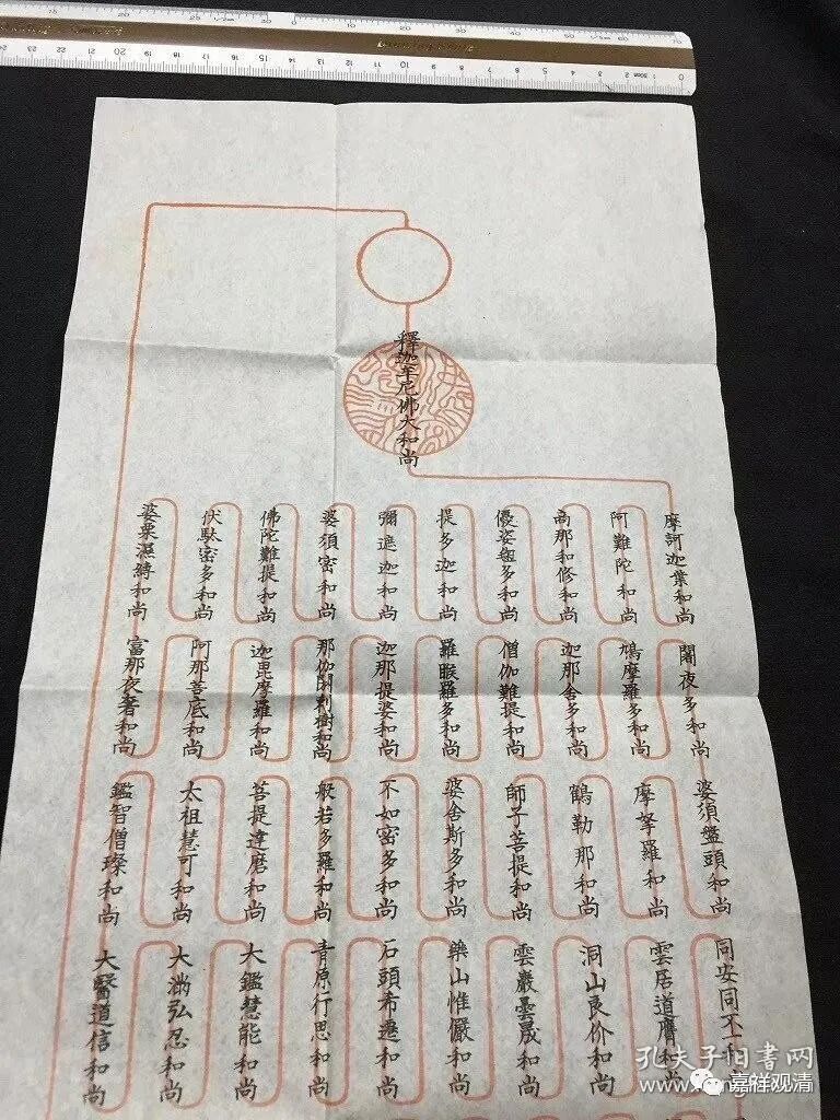 那么,法卷传承的情况现在日本也有,这个传承形式应该不单纯是明清时候出现的,应该比较早就出现了,用这种法卷的形式。我看到过一些日本的戒牒,他们的戒牒的传承方式也是这样的。比如说第一代从释迦牟尼佛开始,然后一代一代地传承下来,戒牒上的传承祖师的排列,用一条线 把一代一代的祖师一个一个“ 串 联” 起来,中间填上人名。(前面那些祖师的名字是一次印刷的,后面空着,发证的时候填上后面最近几代的祖师。)