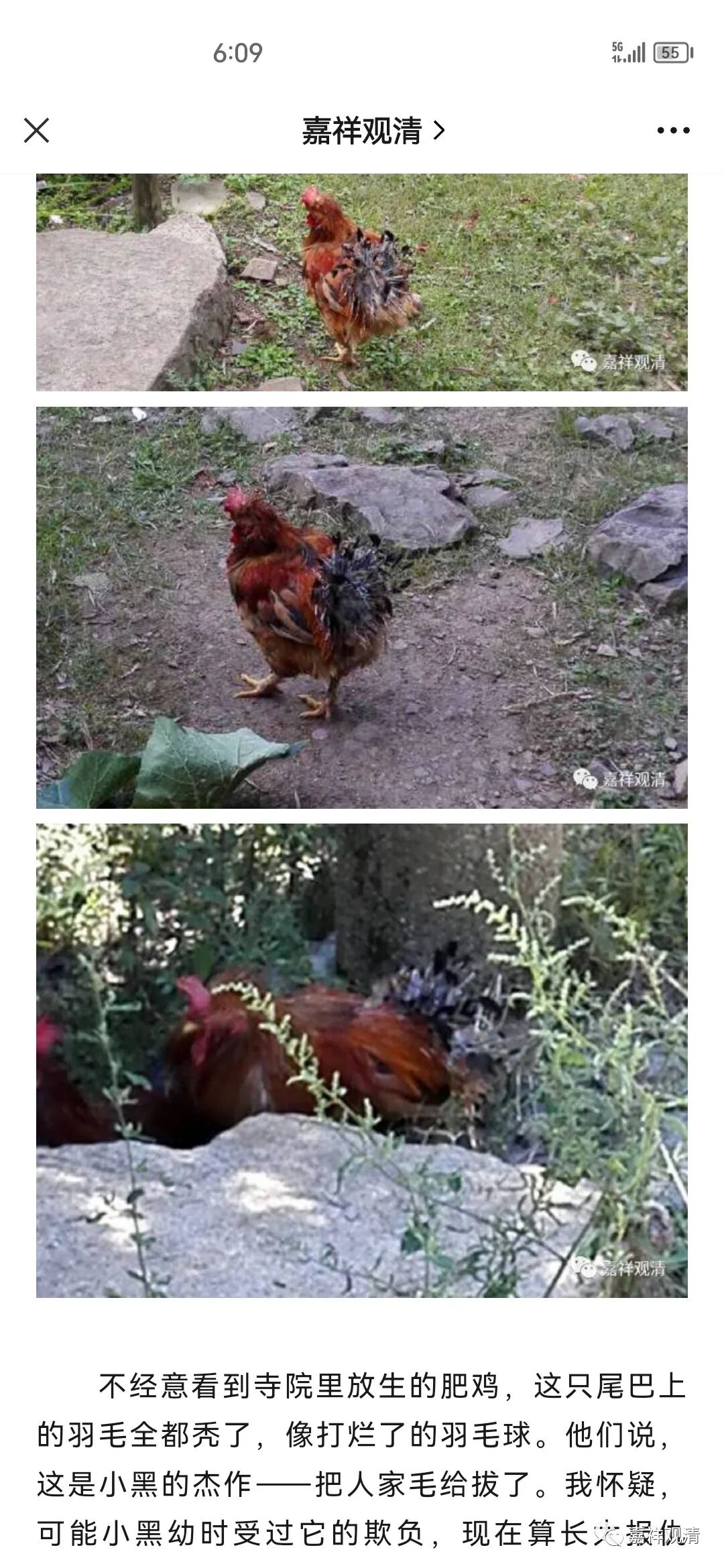 庙里有只大公鸡,是别人送来放生的。常年在庙里的它,大概有了领地意识,看小黑不满意,老是追着它啄。小黑现在就跟着木生。魏老师护着小黑,追着“大花”满寺院跑,顺带完成一天的运动量……还好我在,不然这只人人讨厌的公鸡很可能被全体居士驱逐。
