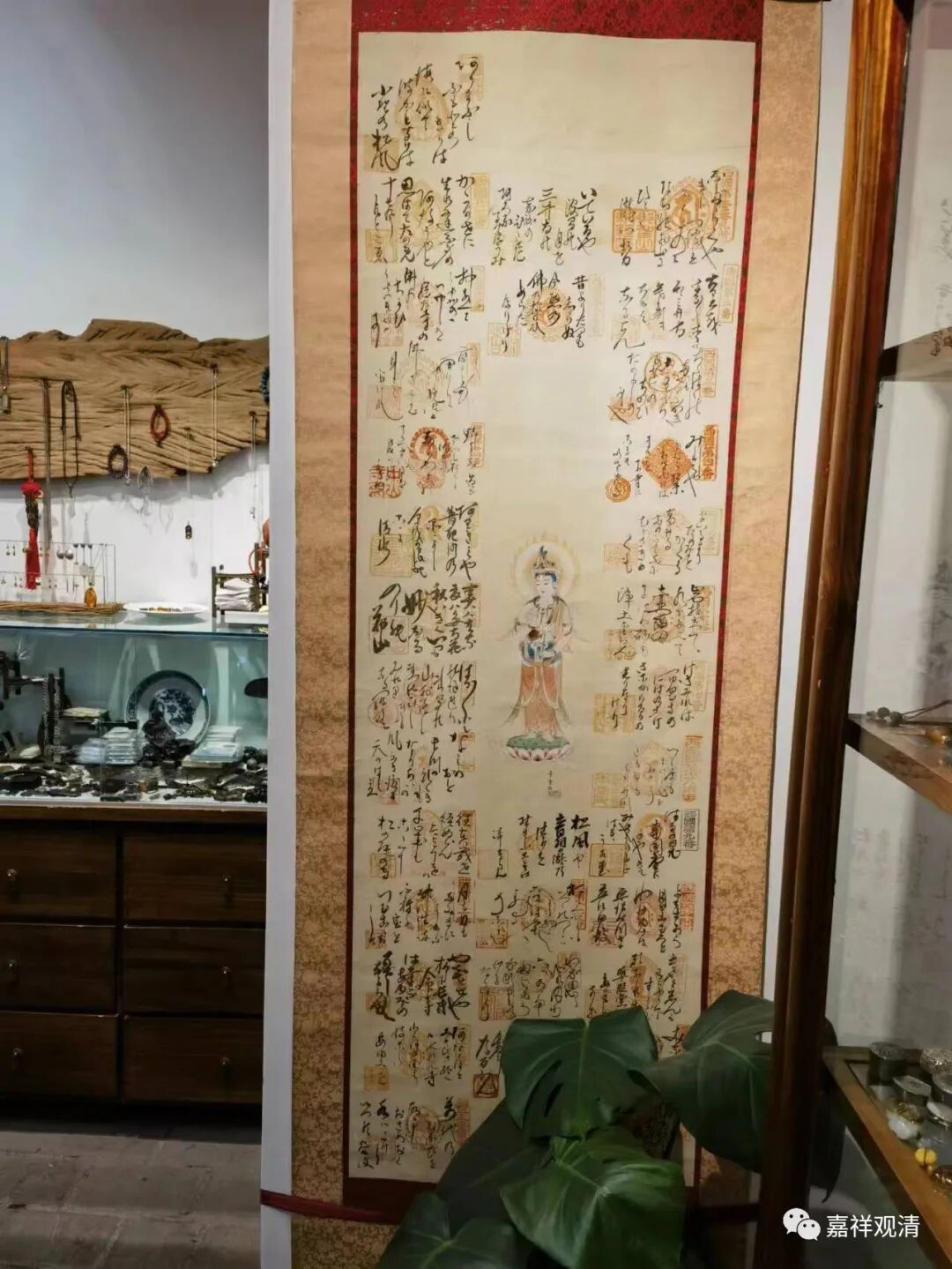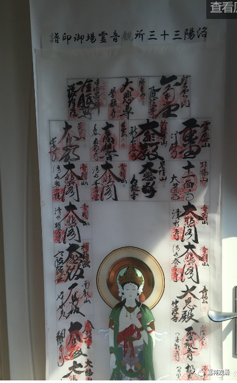 老板并不认同,坚持说这是日本文物,不许我上手,但并不阻止我靠近仔细看(不许我挪动盆栽)。我仔细看了一下,最终明确这确实就是“西国三十三观音”朝圣打卡收集图章(“纳经账”)的挂画。