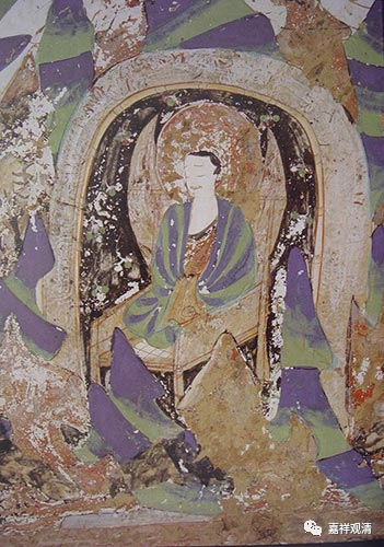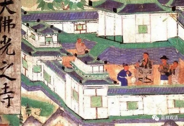 这也是敦煌壁画,山西五台山大佛光寺(今天还在,著名的今天尚存的唐代建筑,梁思成、林徽因找到的),中间的僧人坐在“禅床”上。