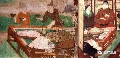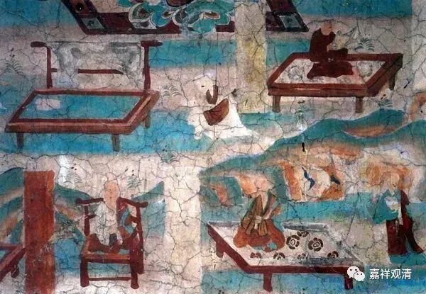 这是敦煌壁画里的“食床”,一大堆食物都放在“食床”上。杜甫《驱竖子摘苍耳》:“登床半生熟”的床就是指的“食床”。