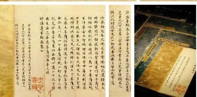 第七卷后有款识:“右《妙法莲华经》第七,《妙音菩萨品》华德妙音以上,故法印业广 / 遗笔也,以下卷第八,家孙法印业孝以秃笔谨补写之 / 愿以此功德,不及于一切,我等与众生。皆共成佛道”。