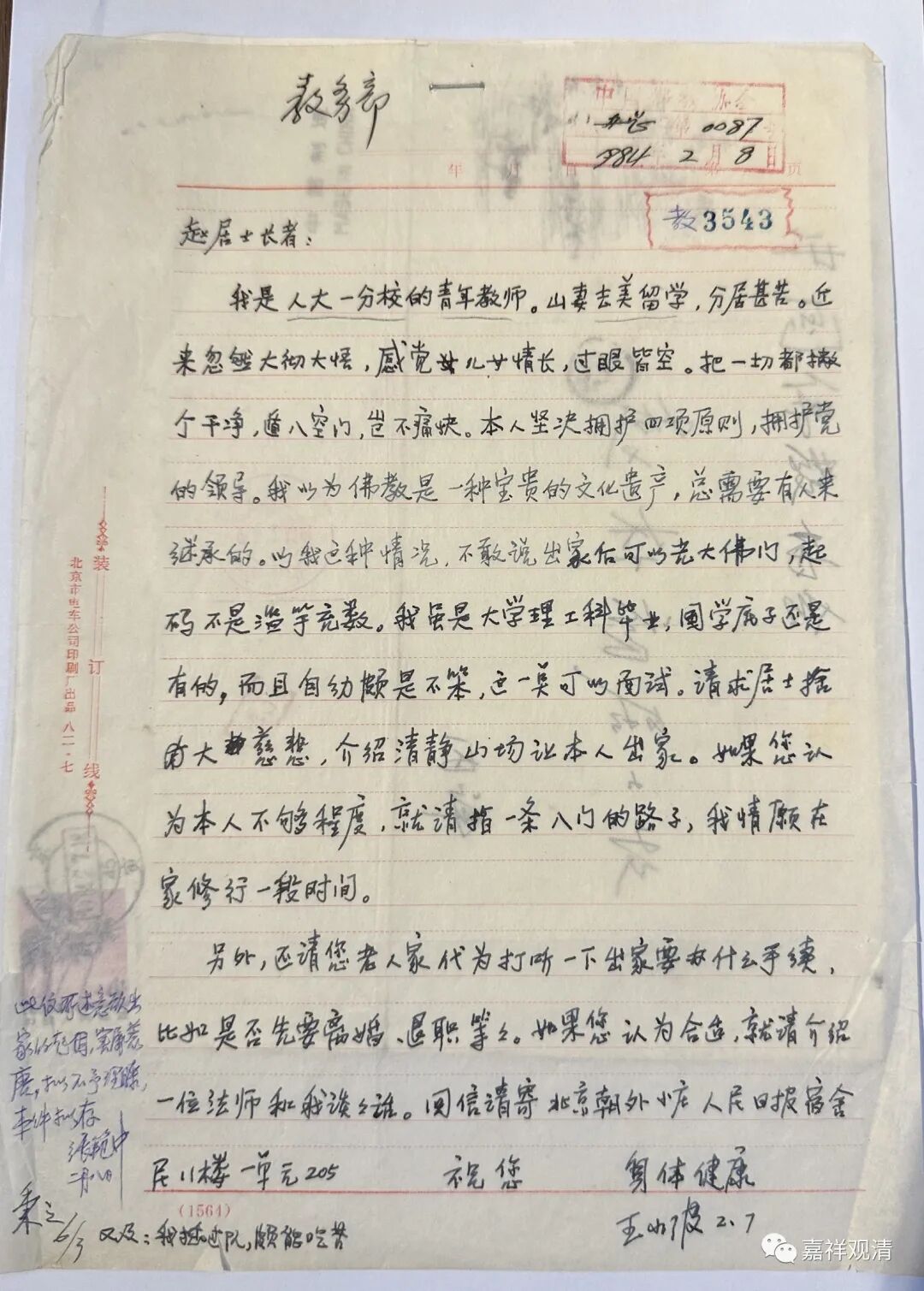 王小波( 1952-1997 )致信赵朴初( 1907-2000 )——“我老婆出国留学了,我想她。我大彻大悟。我要出家!我能吃苦!”