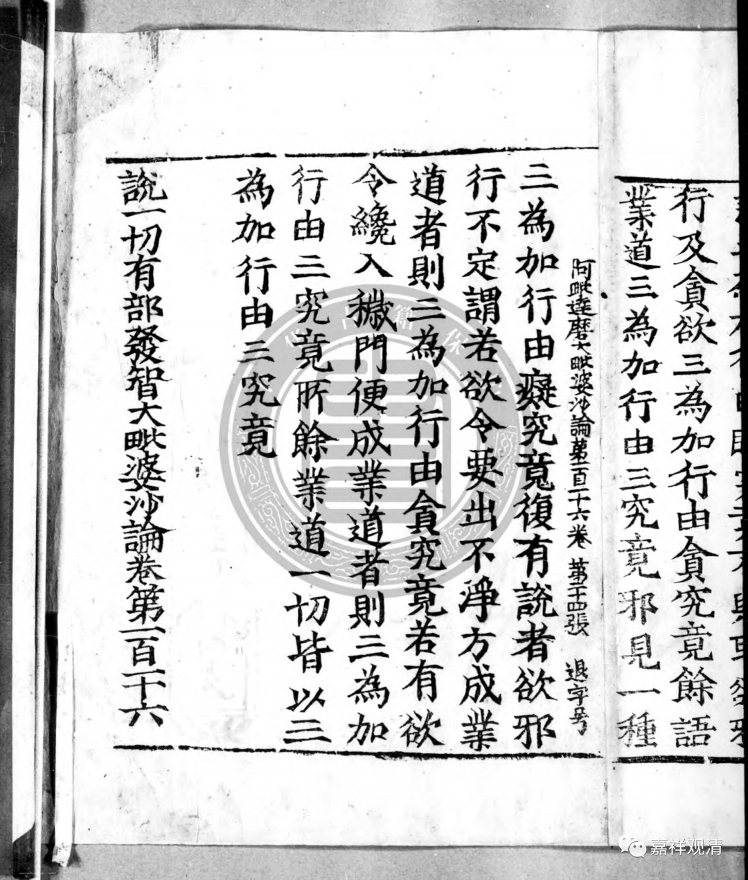 “……《大正藏》校勘记里,则 说“阿毘达磨【宋】【元】【明】【宫】”,意思是, 【宋】《思溪藏》本、【元】《普宁藏》本、【明】《嘉兴藏》本和【宫】 宫内本都做“阿毗达摩大毗婆沙论”而非“ 说一切有部发智大毘婆沙论”,《大正藏》这个和拍卖的这件有点不符的样子。考虑到《普宁藏》的流行短暂,《大毗婆沙论》也不是常见的流通经典,似乎《普宁藏》不应该有不同的版本才对。又考虑到《大正藏》的校勘有一些常见的错漏,有必要有机会去核对一下这几个原版看看。”