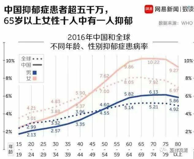 不过即使排除这些数据干扰,今天中国的抑郁症发病率 仍旧是过高了。我们看,我国 65 到 75 岁女性的抑郁症发病率居然已经超过了百分之十!(刚刚收到消息,我的一个亲戚也因抑郁症原因突然过世。)