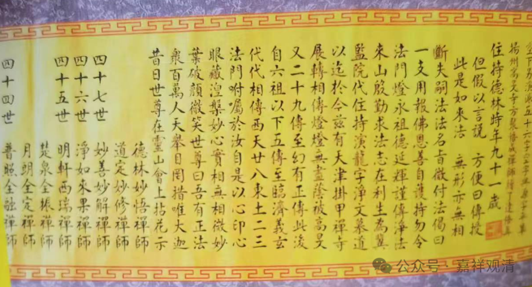 师父也是禅宗的,在高旻寺历任知客、堂主、首座, 2005 年 5 月初接德林老和尚传法法卷,为临济宗下第四十八世。老和尚传法卷那天我也在现场,当时高旻寺刚放戒不久。