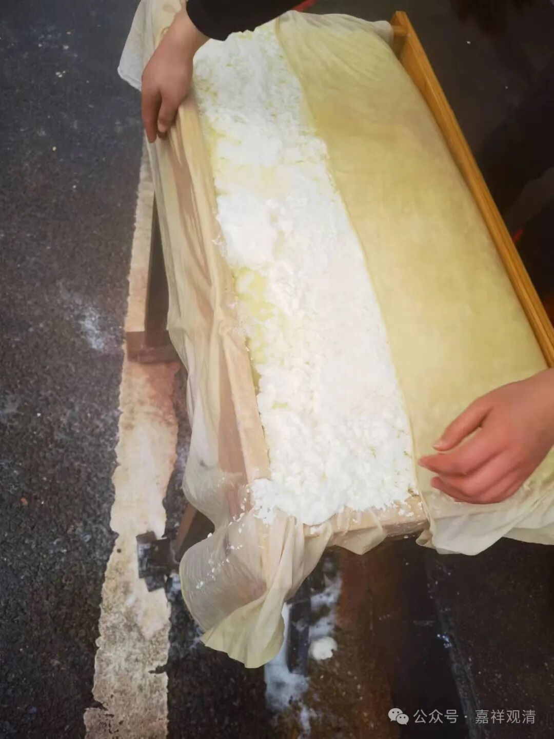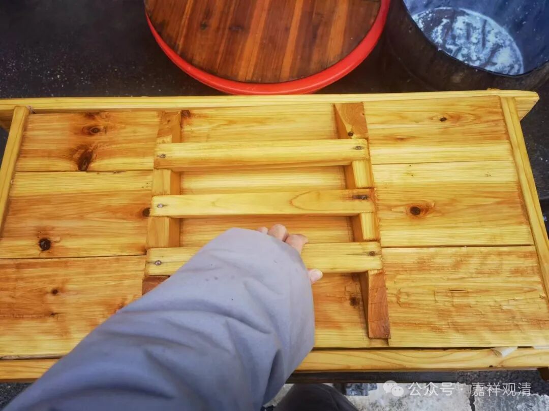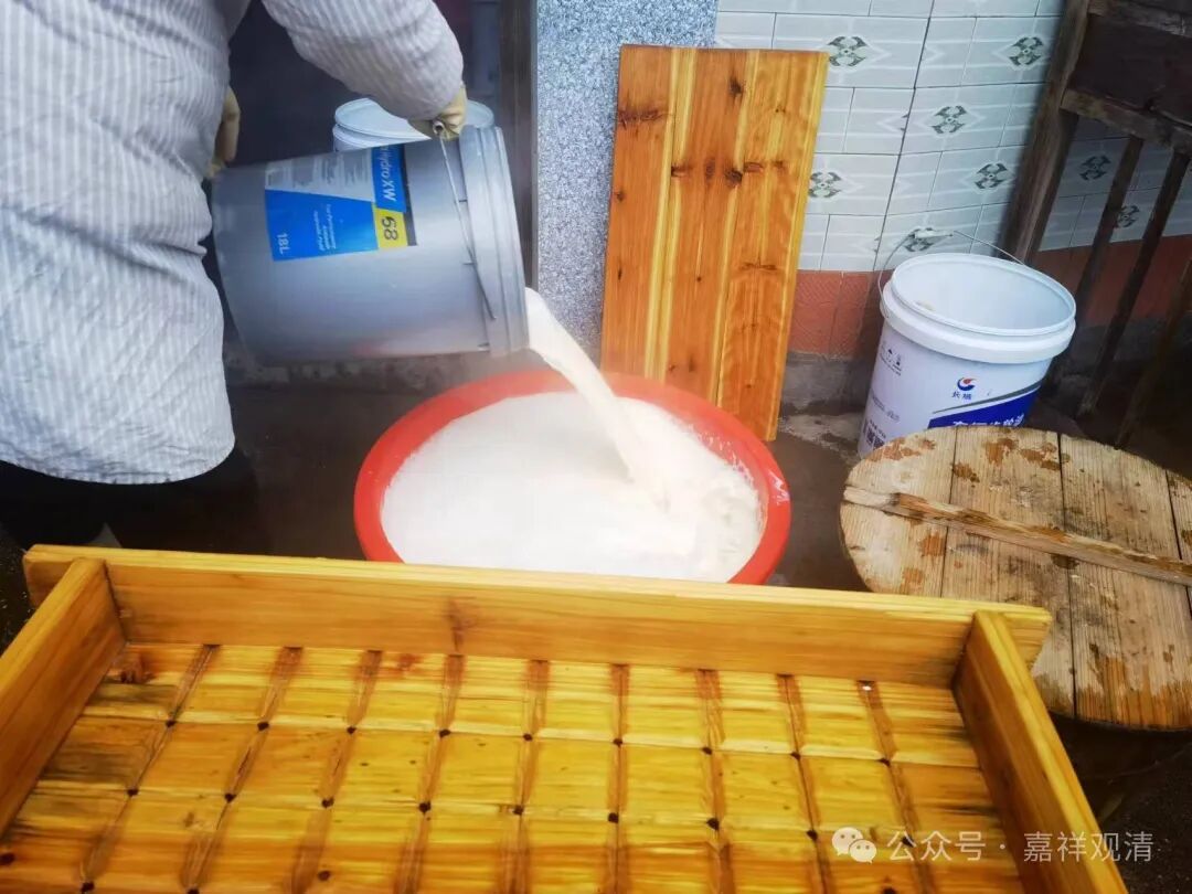 点卤静置后,把豆花舀到木格子里