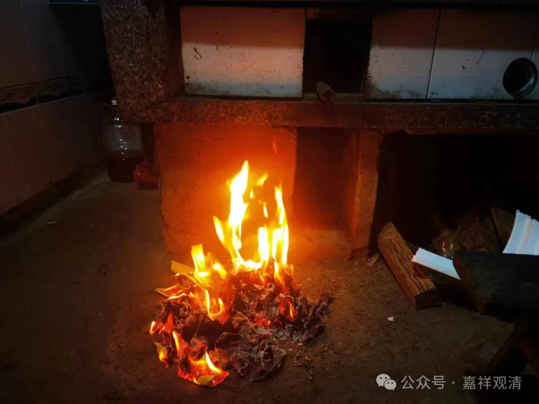 门口烧纸、上供、点炮这一顿搞完还没结束,还要到屋里的灶口烧一堆纸钱,算是祭灶,老居士说是烧给“灶王菩萨”“监斋菩萨”的。