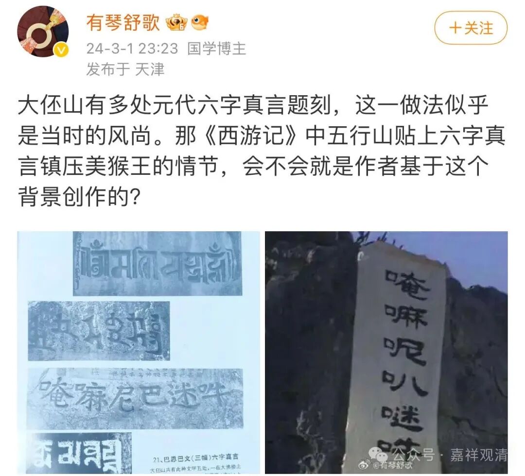 这个微博博主说,大伾山有很多梵、汉、藏、蒙、回文六字真言的摩崖石刻,联系到《西游记》中五行山贴上六字真言镇压美猴王的情节,他怀疑《西游记》这一段的创作灵感和这些大伾山上的摩崖石刻有关。