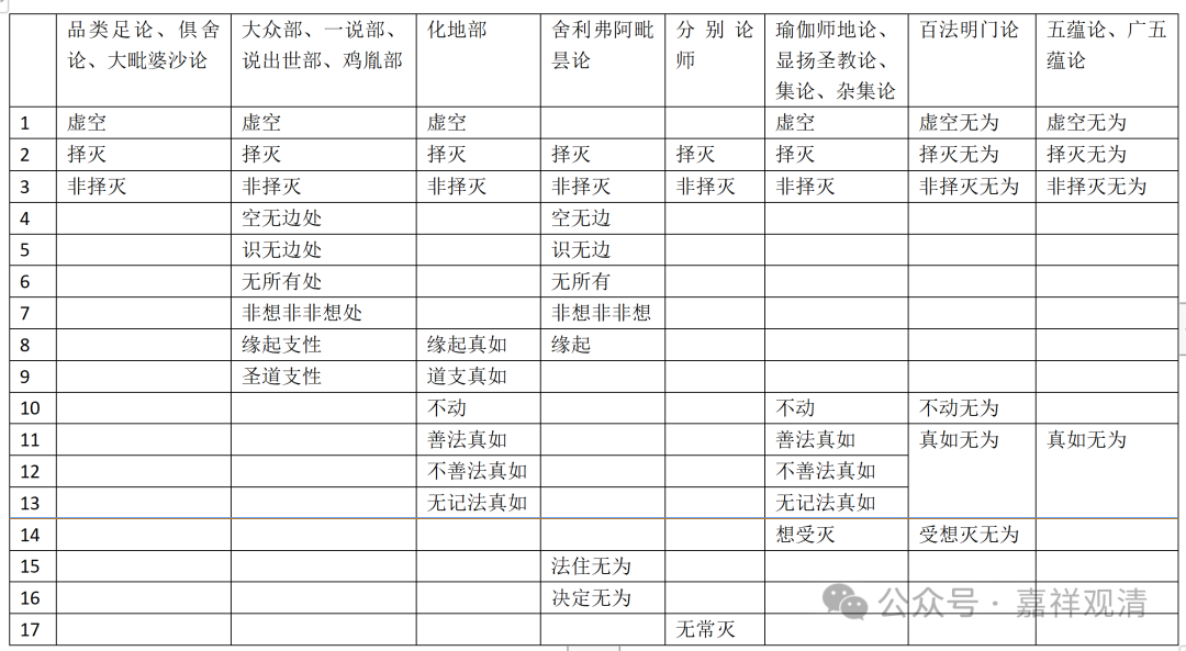 瑜伽行派,《百法明门论》许六无为,《五蕴论》许 四无为,《瑜伽师地论》《集论》等说有八无为。见下表——