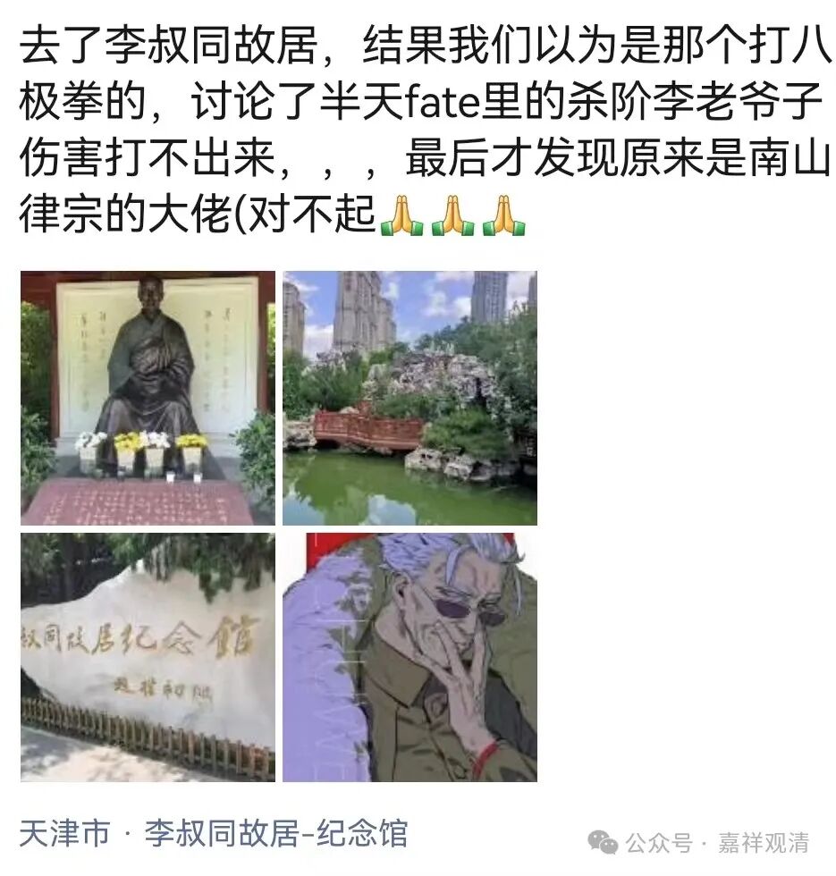 前两天一个刚认识的学佛的兄弟去天津,专门拜访了“李叔同故居”,但是,乌龙了……实际他心里以为这里是“神枪李书文”的故居,属于错拜了码头。可能因为八极拳背景的“神枪李书文”又叫“李同臣”,又是“李”又是“书”又是“同”的,给搞混了。