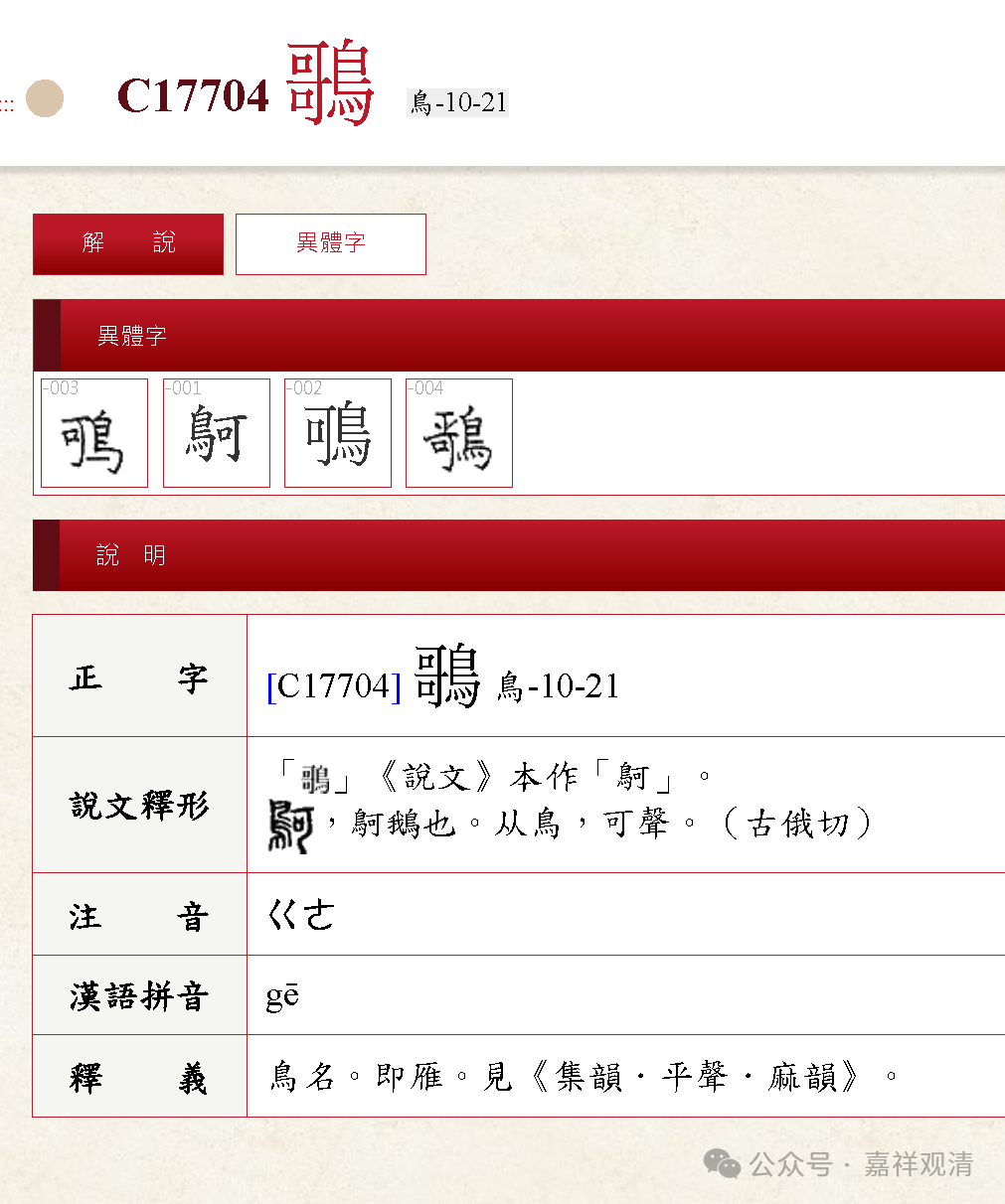 咦,果然找到它了,是个异体字,著名的俗字宝典《龙龛手镜》里有他,还是念作ge。电脑可以打出来这个——鴚。