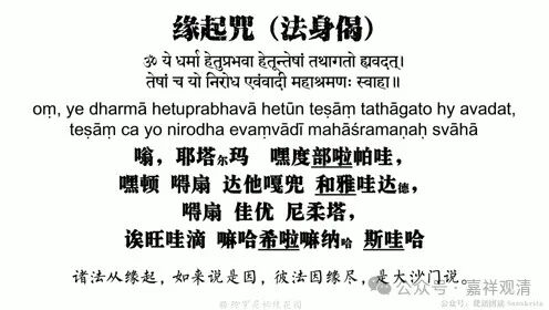 第一次列席瑜伽焰口法会,等于我在现场读了一遍原文,倒也发现几个问题。《瑜伽焰口》里有一段“缘起咒”,说这是“十二缘起咒”,这种说法是错的,这里的“十二缘起咒”实际只是“缘起咒”,与“十二缘起”没关系,编纂者可能看到“缘起咒”就顺手写上“十二缘起咒”了,其实“缘起咒”就是“缘起偈”——“诸法因缘生,如来说是因;法灭亦如是,是大沙门说”——的梵文版而已。