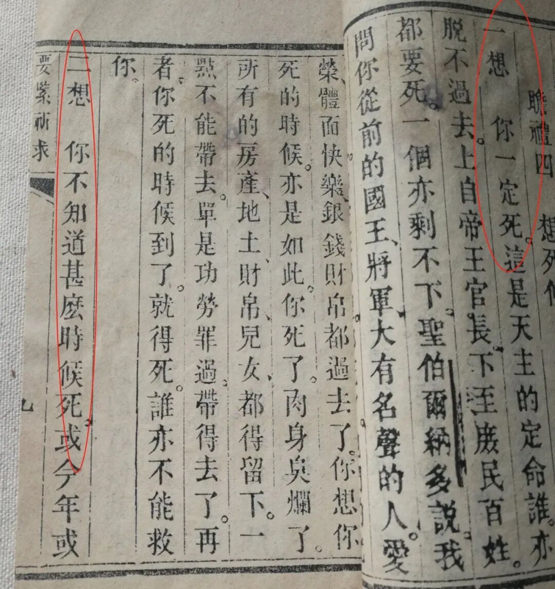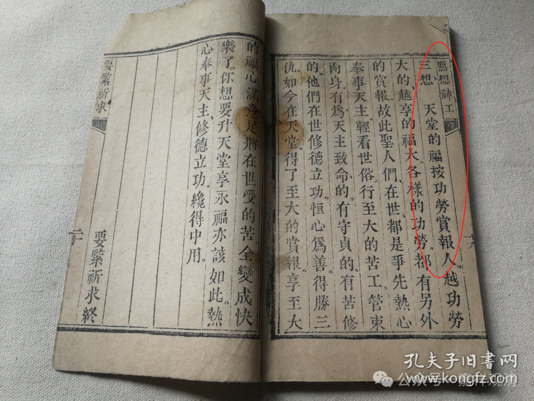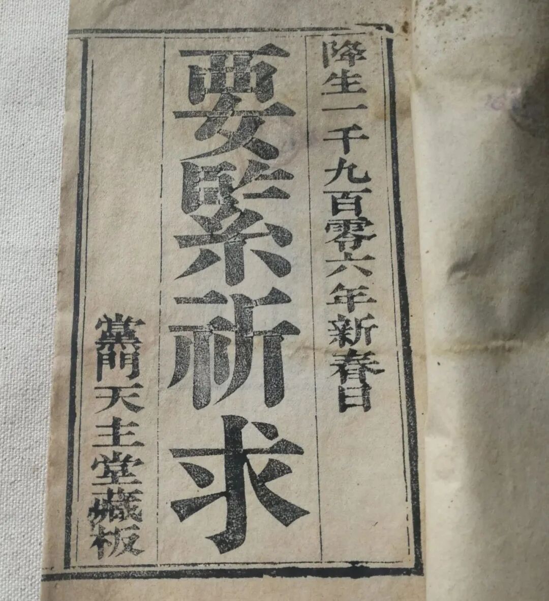 这是清光绪三十二年( 1906 )山西长治“党门天主堂”(属于圣方济各教会)藏版的天主教流通的木刻本《要紧祈求》。