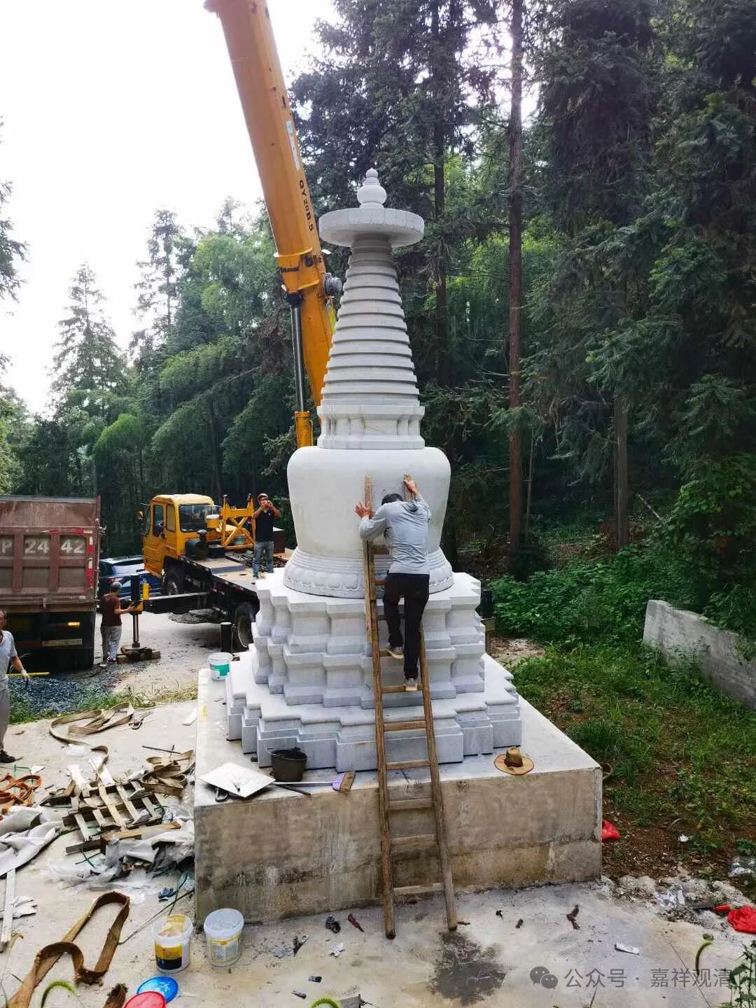 上午装完“如来八塔”,又吊装了五米高仿五台山的大白塔