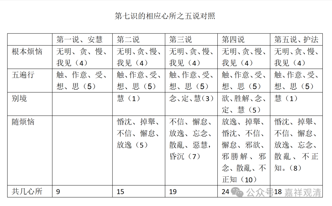 1 、安慧说:认为第七识相应心所有九,即“我痴、我见、我爱、我慢”加五遍行“触、作意、受、想、思”;
