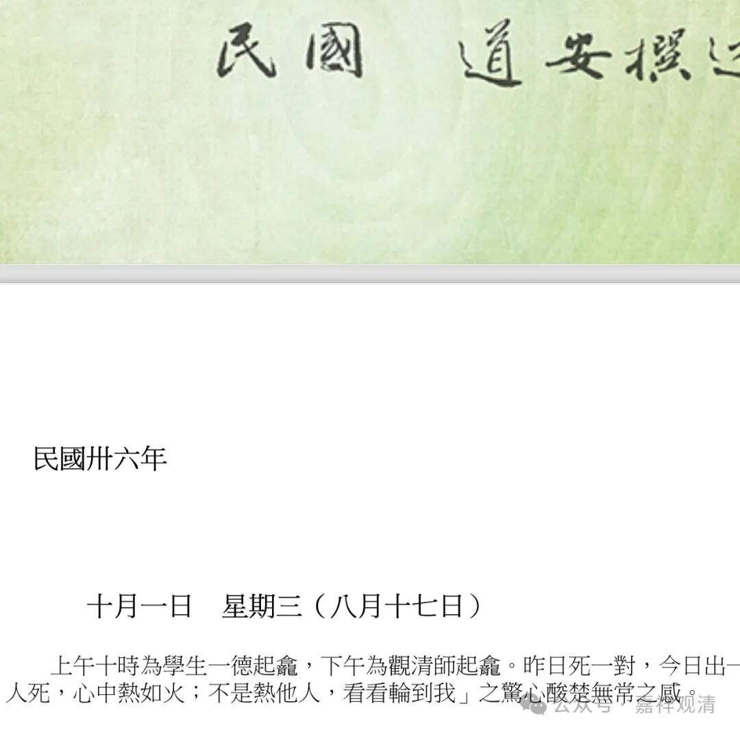 “ 上午十時 , 為學生一德起龕 , 下午為觀清師起龕。昨日死一對 , 今日出一雙 , 真有點 “ 我見他人死 , 心中熱如火 , 不是熱他人 , 看看輪到我 ” 之驚心酸楚無常之感。 ”