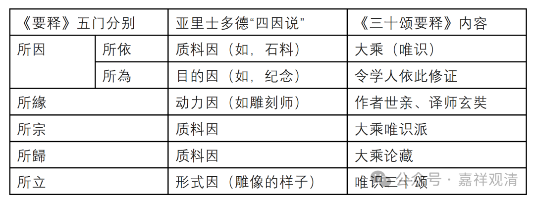 | 《要释》五门分别 | 亚里士多德 “四因说” | 《三十颂要释》内容 |