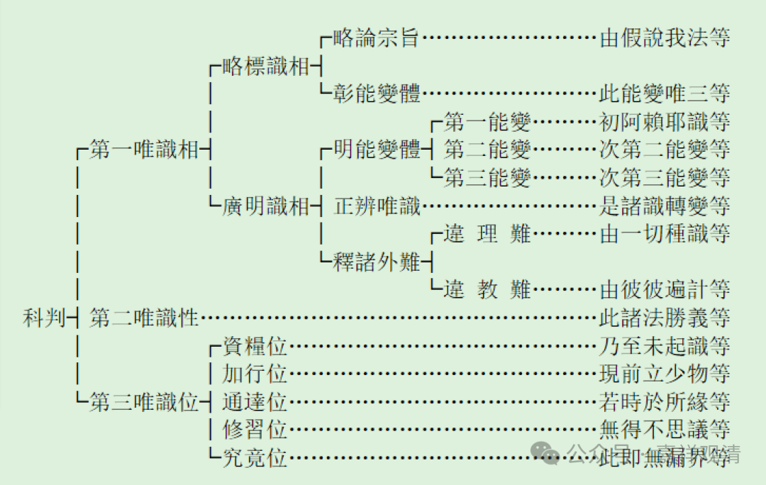 就是这 张图,大家可以看一下啊。我们看这里面它的分类比较,这个科判是谁的呢?这个科判是属于护法 ——玄奘 系唯识的说法。